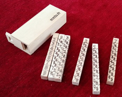 Calculette inventée par Neper en 1617.La première réglette à gauche sert de multiplicateur. Le nombre à mutiplier est affiché au sommet des réglettes de droite. Le produit de la multiplication est obtenu en additionnant en oblique les chiffres à droite du mutiplicateur. L'opération se fait de droite à gauche en faisant les éventuelles retenues.
